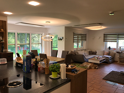 Neben Licht und Beschattung können die Heizkreise, basierend auf Infrarot-Technologie mit evon Smart Home gesteuert werden. Dies kann zeitlich durch Absenkbetrieb erfolgen, wenn die Bewohner das Haus verlassen und durch Komfortbetrieb, bevor sie wieder nach Hause kommen. Wenn die PV-Anlage Überschuss meldet, wird im Winter zusätzlich zu diesen Zeiten die Heizung aktiviert.
